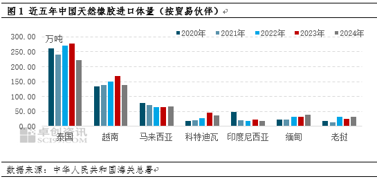 天然橡胶因自给率偏低,进口依存度高达80%以上,而核心来源主要从东南亚主要产胶国以及非洲科特迪瓦进口为主。从近五年中国天然橡胶进口体量数据来看,主要来源国以泰国、越南、马来西亚以及科特迪瓦等为主,而伴随着最不发达国家免关税政策影响,缅甸、老挝等进口体量有望提升。从2024年进口数据来看,以上四个国家进口体量占总进口量的82.2%。因此从进口数据来看,中美关税问题对天然橡胶进口影响有限,而核心影响则在于对商品市场运行环境以及天然橡胶需求预期的冲击。