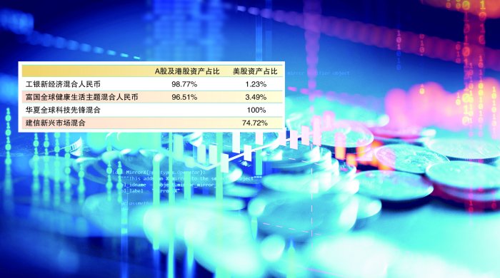 记者发现,在业绩排名居前的QDII产品中,截至一季度末,大多数重仓了A股及港股等中国资产。例如,工银新经济混合人民币持有A股和港股的资产比例分别为73.37%和25.4%,美股仅占1.23%;富国全球健康生活主题混合人民币投资A股及港股资产比例合计为96.51%,美股为3.49%。