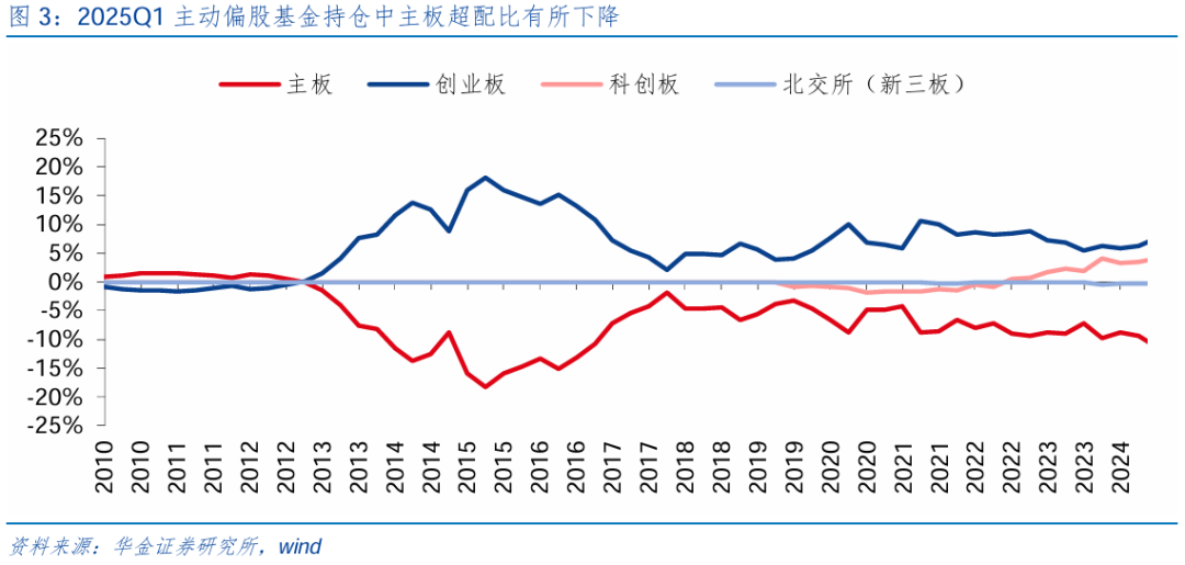 主板、科创板持仓比上升,创业板仓位下降。(1)仓位方面,25Q1主动偏股型基金持仓中主板仓位为66.8%,较2024Q4的65.8%上升了0.9pcts;创业板的仓位为18.1%,较2024Q4的19.6%下降了1.5pcts;科创板的仓位为14.8%,较2024Q4的14.0%上升了0.9pcts;北证的仓位为0.3%,小幅上升0.06pcts。(2)超低配比方面,一季度基金主板超配比为-15.5%,较2024Q4的-10.5%下降了5.0pcts;创业板超配比为4.9%,较2024Q4的5.0%下降了0.1pcts;科创板超配比为10.7%,环比2024Q4的5.9%上升了4.8pcts;北证的超配比为-0.1%,环比上升了0.4pcts。