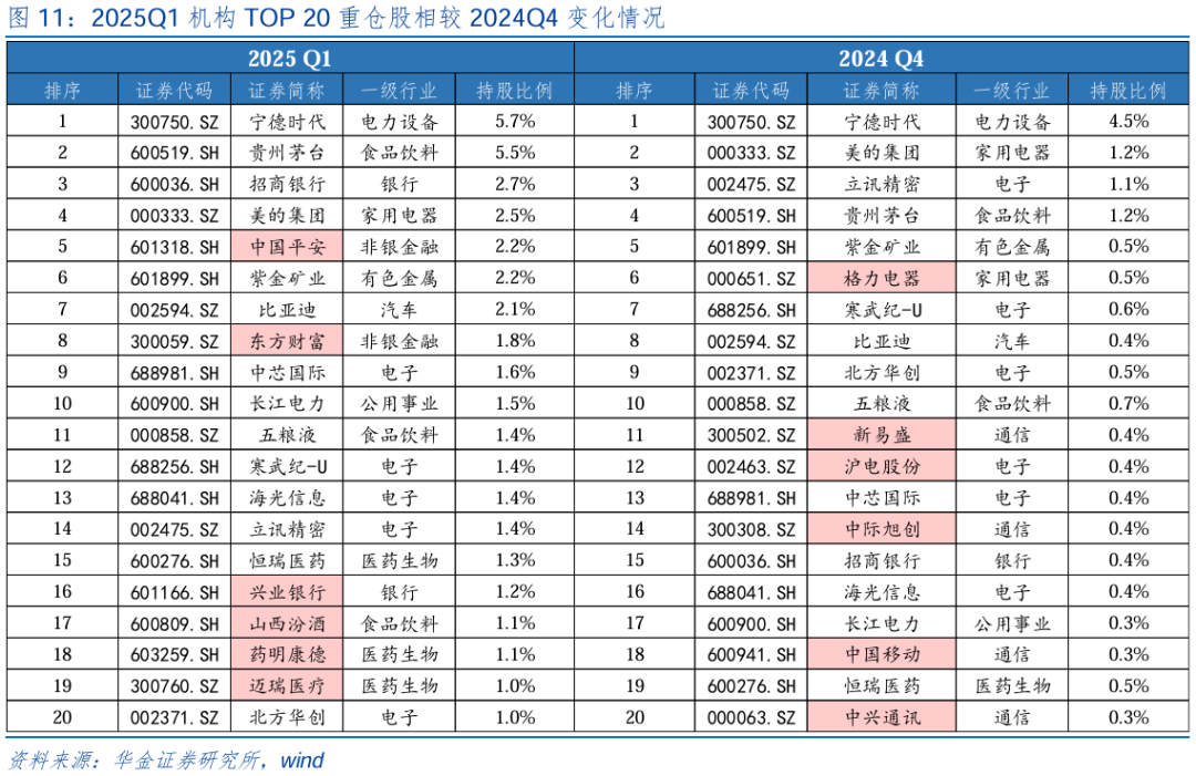 Top20个股以电子、汽车和通信行业获加仓居多。(1)个股角度来看,宁德时代、美的集团、贵州茅台维持TOP 5不变,而格力电器、新易盛、沪电股份、中际旭创、中国移动、中兴通讯跌出TOP 20,中国平安、东方财富、兴业银行、山西汾酒、药明康德、迈瑞医疗新晋前20。(2)从加减仓情况来看,加仓前二十个股以电子(4只)、汽车(3只)、通信(2只)、公用事业(2只)居多,其中加仓前三分别为比亚迪、紫金矿业、芯原股份;减仓前二十个股以电子(4只)、医药生物(3只)等居多,其中减仓前三个股分别为宁德时代、五粮液、中信证券。