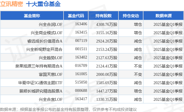 根据2025基金Q1季报公募基金重仓股数据,重仓该股的公募基金共935家,其中持有数量最多的公募基金为兴证全球基金的兴全合润LOF。兴全合润LOF目前规模为226.0亿元,最新净值1.525(5月9日),较上一交易日下跌0.49%,近一年上涨6.05%。该公募基金现任基金经理为谢治宇。谢治宇在任的基金产品包括:兴全合宜混合(LOF)A,管理时间为2018年1月23日至今,期间收益率为50.59%;兴全社会价值三年持有混合,管理时间为2019年12月26日至今,期间收益率为53.49%;兴全合润混合C,管理时间为2025年4月8日至今,期间收益率为8.86%。