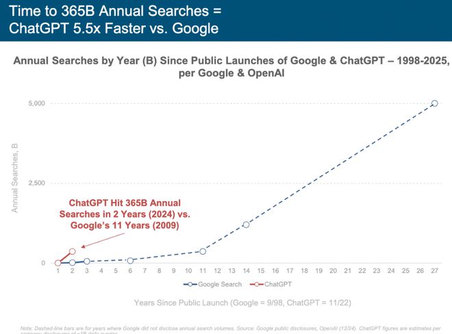 ChatGPT还在蚕食搜索市场份额,其年度搜索量已经达到3650亿次,是谷歌的5.5倍。但这种史无前例的普及速度,也意味着竞争的白热化程度同样史无前例。