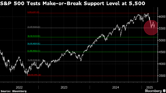 标普500指数周四低开逾3%,纽约早盘一度下跌4.5%。指数来到5500点附近的修正位。观察均线和其他指标以确定市场动能的技术分析师指出,这个关键的心理位置下方几乎没有能够吸引逢低买入的点位。