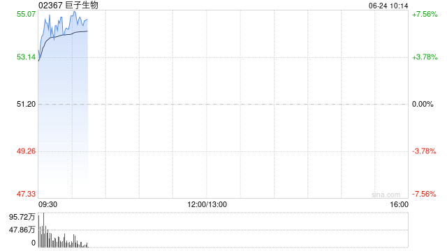 巨子生物(02367)早盘股价上涨6.35%,现报54.45港元,成交额5.46亿港元。